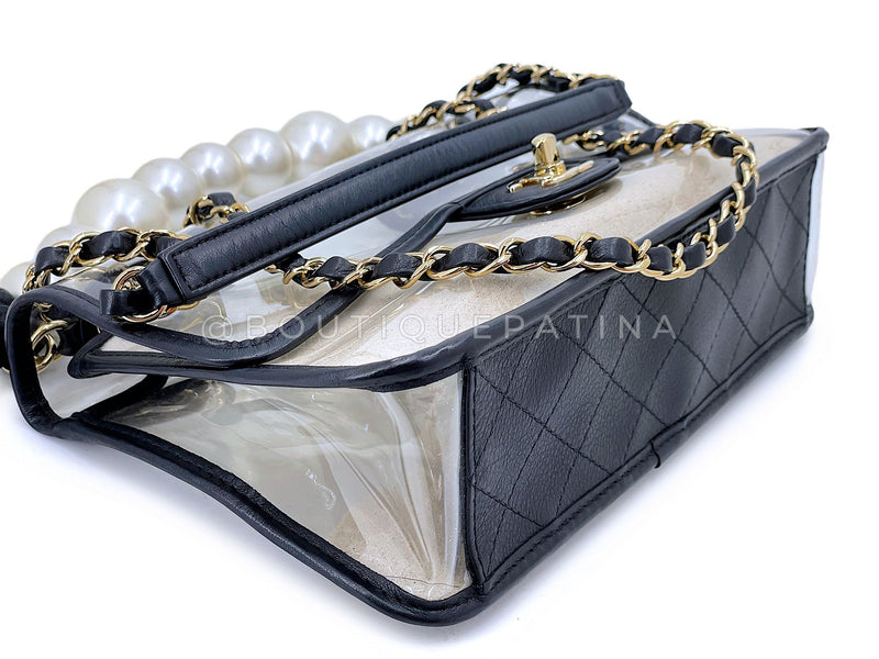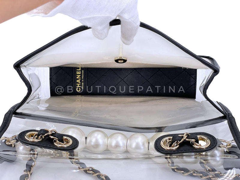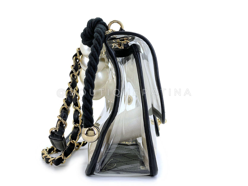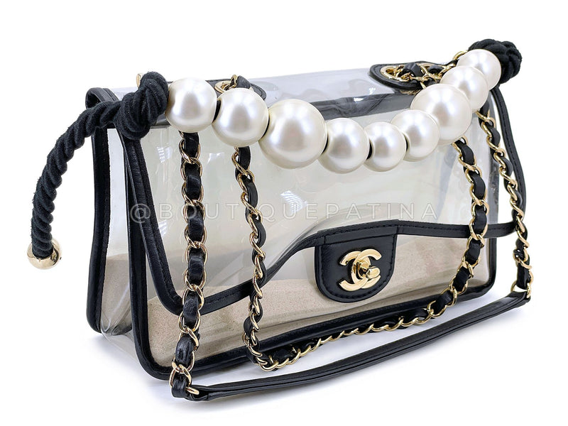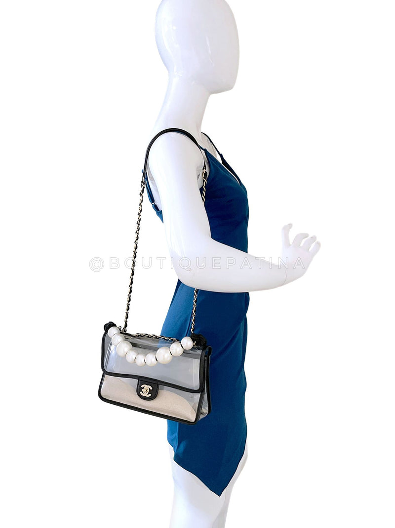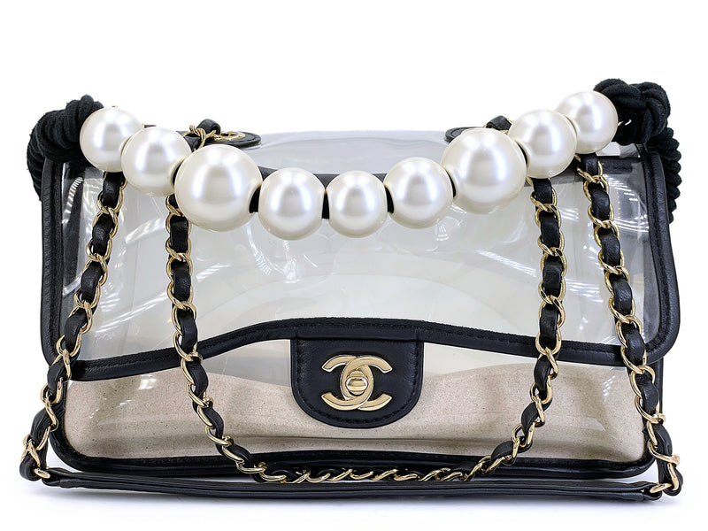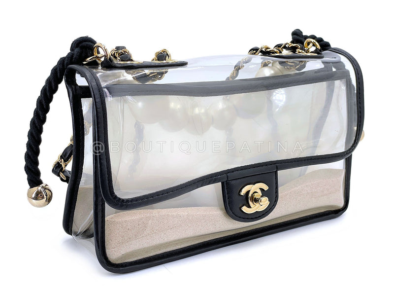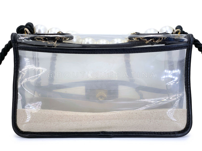 In 2019 Spring, Karl Lagerfeld hosted his epic show "by the sea" with many summery, sea-themed attributes, and this bag from the runway is no exception. This Chanel Sand by the Sea Pearl and PVC Flap Bag is a limited edition treasure from this runway collection. It has sand encased in the front and back panels, and giant faux pearl baubles serving as a handle, and a double chain strap that can be worn single to boot. The "clear" version of everything Chanel classic flap - including a back pocket to boot, front turnlock CC clasp and woven double chain straps.