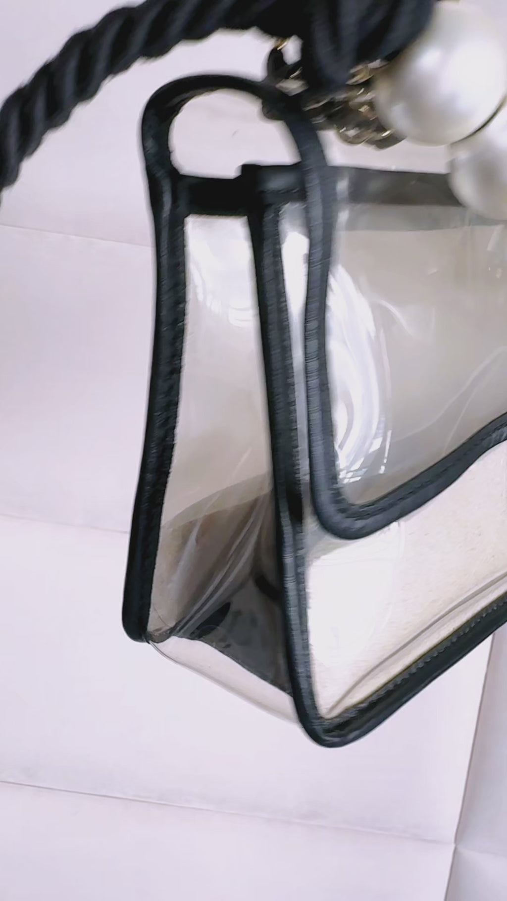The black trim is in lambskin, contrasting with the clear PVC. It is normal to have some free sand particles in the bag.