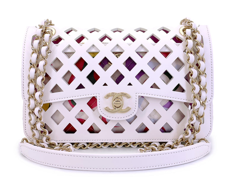 A whimsical, lightweight Chanel flap with intricate laser-cut diamond cutouts in smooth white calfskin.