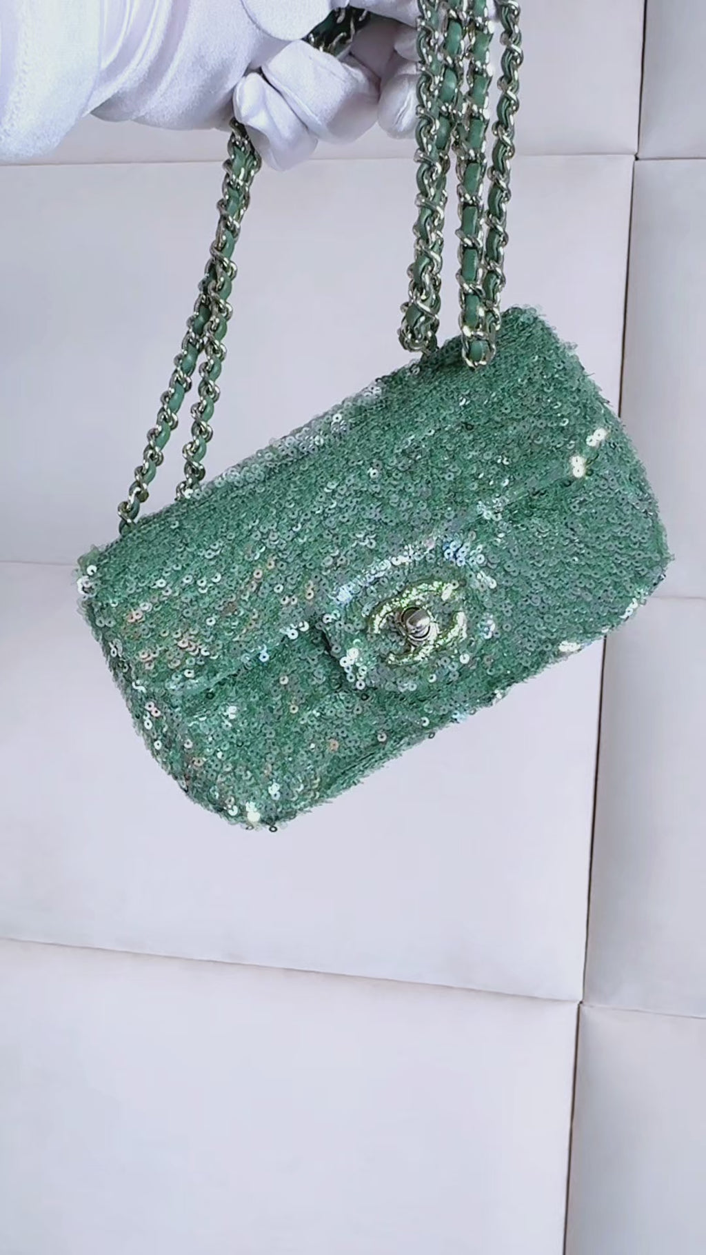 Rare Chanel Mermaid Green Sequins Mini Flap Bag Etched CC SHW KMD