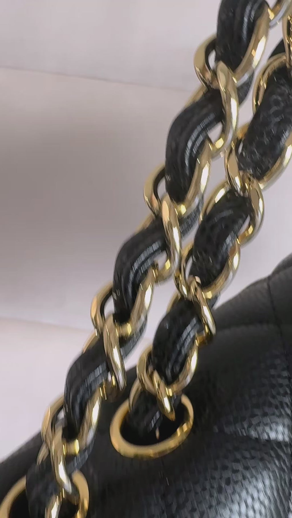 In Black caviar leather and gold hardware. In caviar leather, the classic flap is durable with the pebbled grain nodes of calfskin leather.