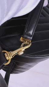 In Black lambskin leather and aged gold hardware.