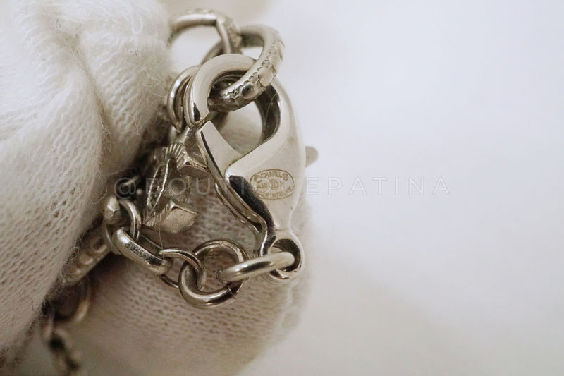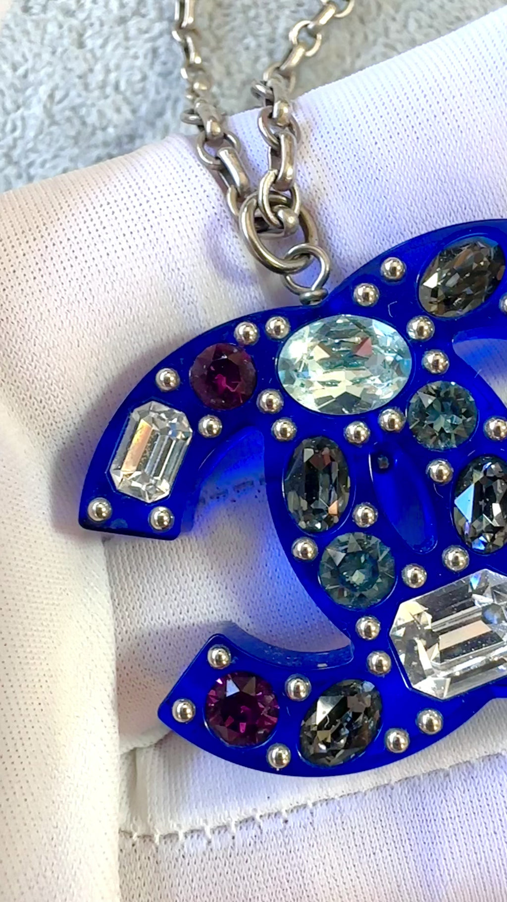 Chanel 18P Blue Crystal Embedded CC Logo Necklace Silver chain, blue clear resin CC logo embedded with gray, pink, white and light blue large crystals of different shapes